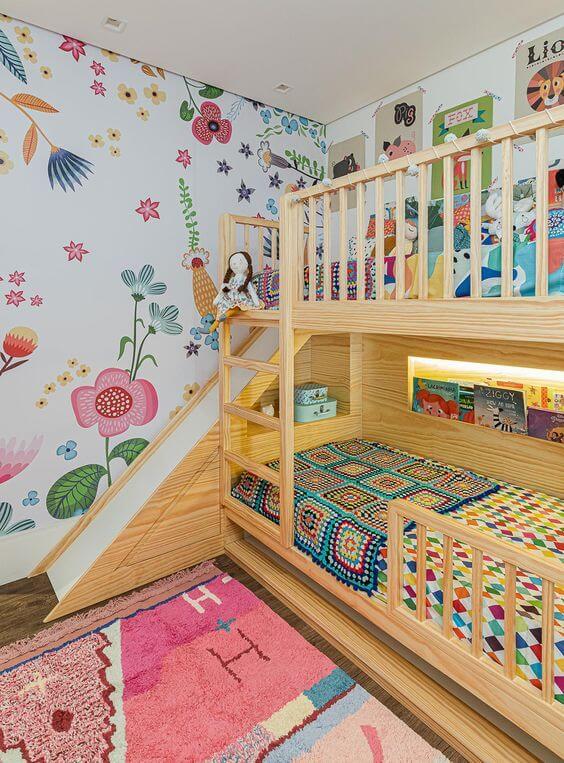 Mas se você estiver montando um quarto infantil, faça uma beliche planejada com escada e um escorregador, assim elas ganham um espaço a mais para brincar e se divertir no quarto. Depois, quando elas não gostarem mais do escorregador, é só tirar e ficar apenas com a escada.