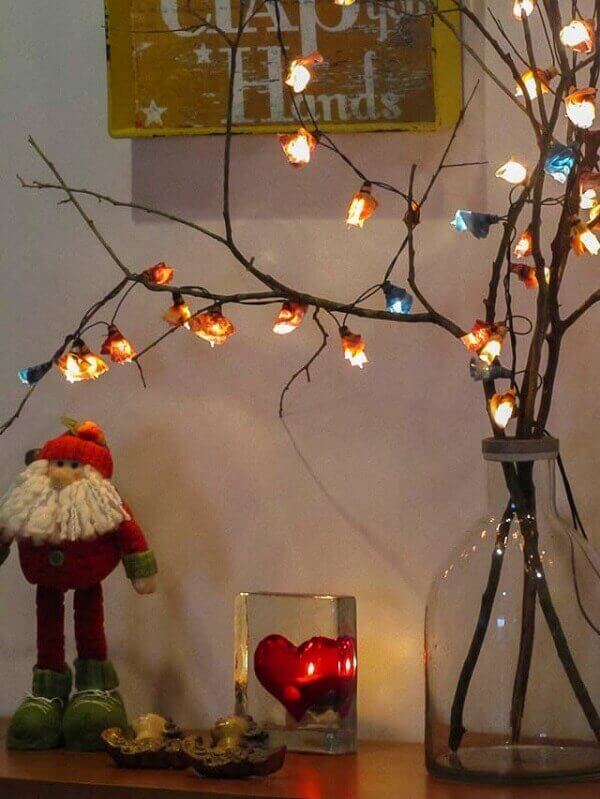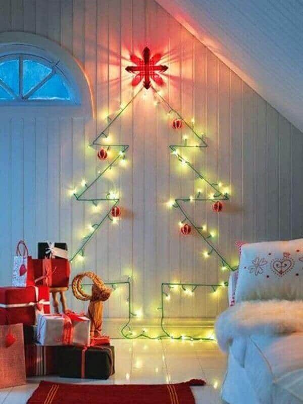 Na sala de estar a tradicional árvore de natal foi substituída por um desenho estilizado com luzes na parede. Esse enfeite tem um custo baixo e o material é facilmente encontrado em lojas de materiais de construção ou bazares.