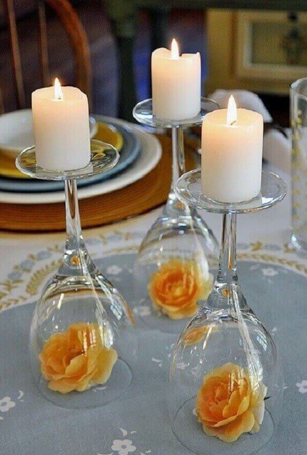 Nas laterais da mesa foram utilizados dois castiçais em vidro transparente com velas vermelhas e no centro uma fruteira de cristal alta.