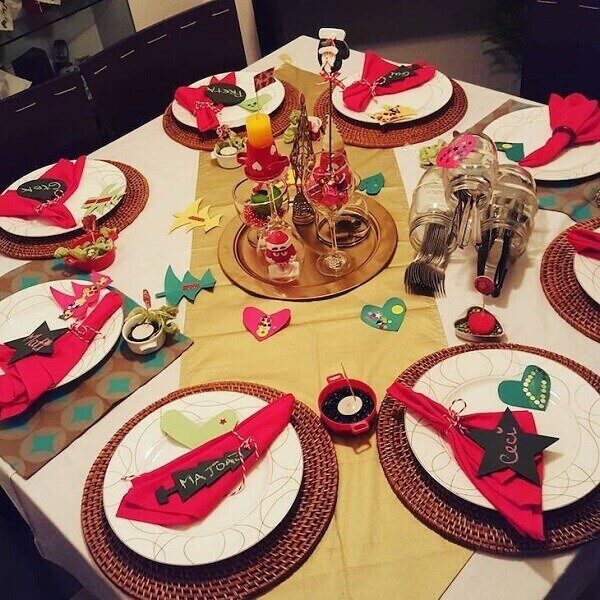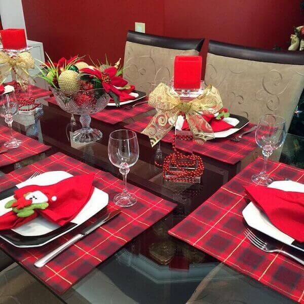 A mesa recebe uma decoração de natal simples e barata com jogos americanos de padrão xadrez na cor vermelha. Você pode utilizar louças brancas e guardanapos vermelhos personalizados para contrastar com os outros elementos decorativos da mesa.