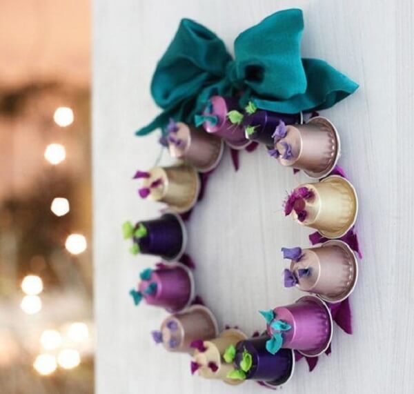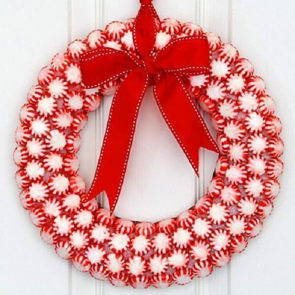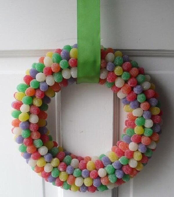 A guirlanda com jujubas é super fácil de fazer, por isso você pode inclusive pedir ajuda das crianças para criar este lindo enfeite natalino. Para a confecção dessa guirlanda você irá precisar de um suporte redondo vazado de isopor, palitos de dente, fitas de cetim e balas de jujuba coloridas. Quanto ao passo a passo, basta quebrar os palitos de dente ao meio e prender as balas de jujuba na superfície do isopor até completá-lo. Por fim, prenda uma fita de cetim na sua guirlanda e pendure na porta.