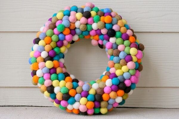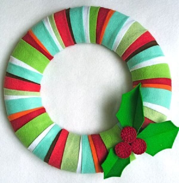 Para a confecção dessa guirlanda de natal você irá precisar de um suporte redondo vazado de isopor, cola branca e diversas tirar coloridas de feltro. Para conseguir esse efeito é necessário enrolar as tirar coloridas de feltro no suporte de isopor redondo, lembrando que para a fixação das tiras no isopor é necessário passar cola branca no tecido.