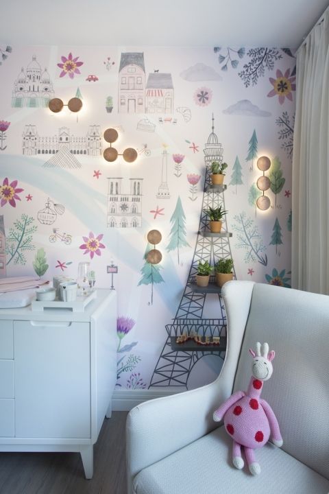 Uma forma de destacar a decoração para o quarto de bebê é por meio do papel de parede (e isso vale para todos), pode ser desde a temática do seu ambiente ou algo mais neutro, como flores, pets e até inspirado em uma cidade, como quarto de bebê tema paris.