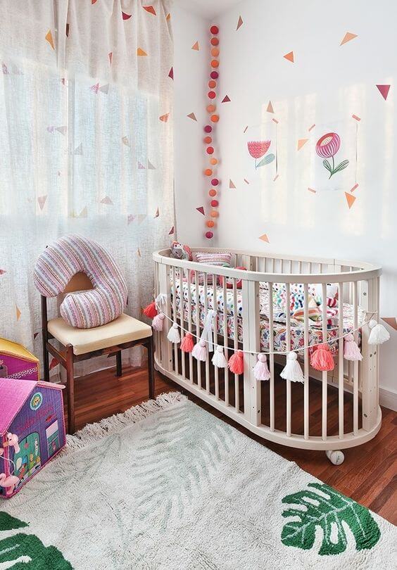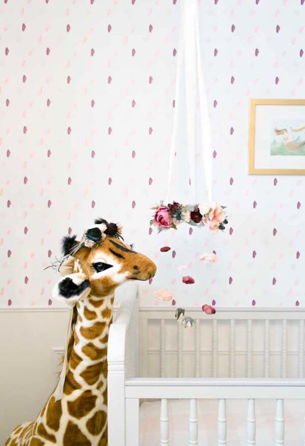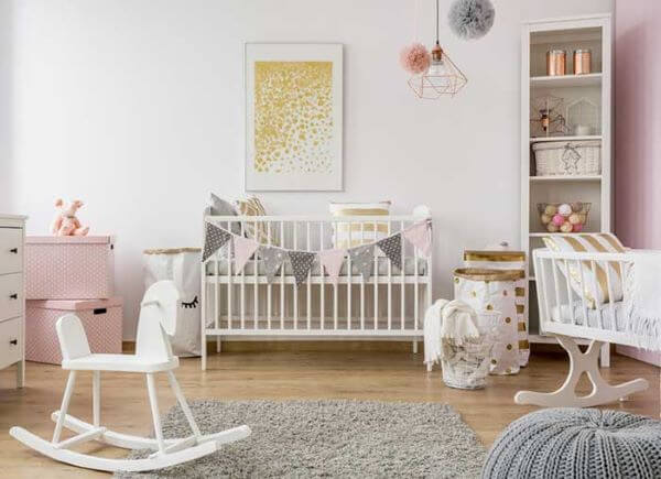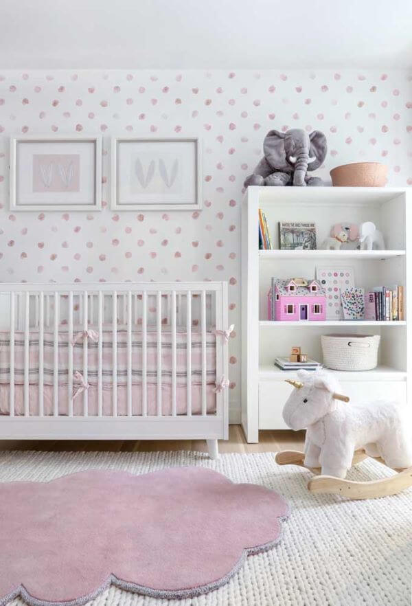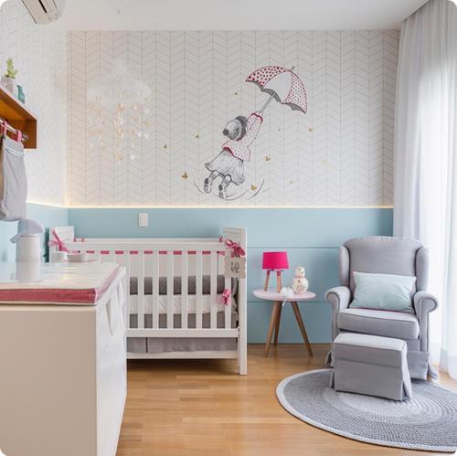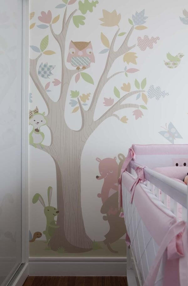 Os temas para quarto de bebê feminino costumam ser mais delicados, feitos em cores claras e com muitos detalhes fofos.