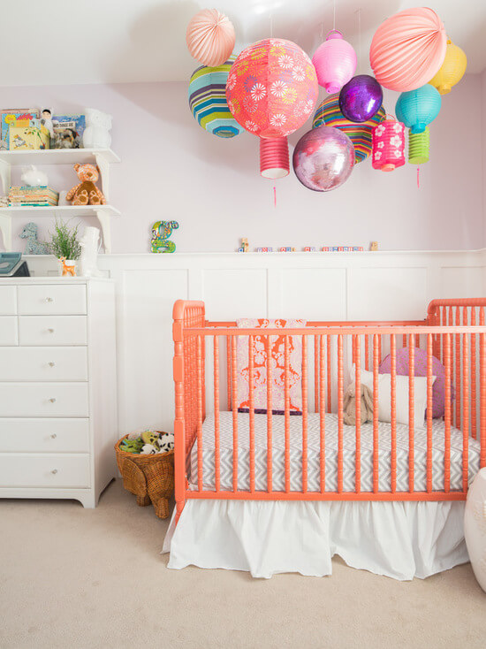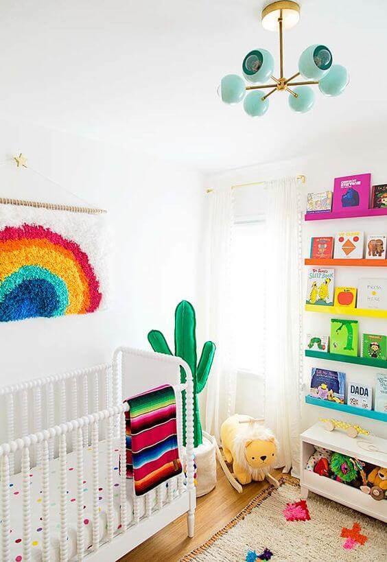 Caso você seja fã de algum desenho, pode usar alguns detalhes nesse tema, como bonecas, ursos de pelúcia e livros temáticos. Porém, nada exagerado. Também aproveite para caprichar na escolha do lustre do quarto. Faz muita diferença.