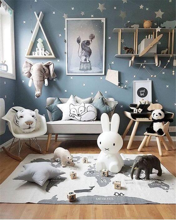 Use as cores que lembrem a floresta, como verde e até alguns toques de laranja. Também vale colocar prateleiras com muitos ursos nelas, ou até decorar o berço. Use girafas, macacos, onça, leão… Animais que as crianças amam!