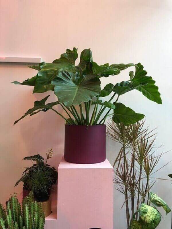 É uma planta bem grande com folhas largas e grandes. O interessante dela é que quase não tem caule. É ideal em ambientes de meia sombra, você não precisa de vasos muito grandes e fundos, mas a umidade é importante, por isso não esqueça de molhar suas plantas.