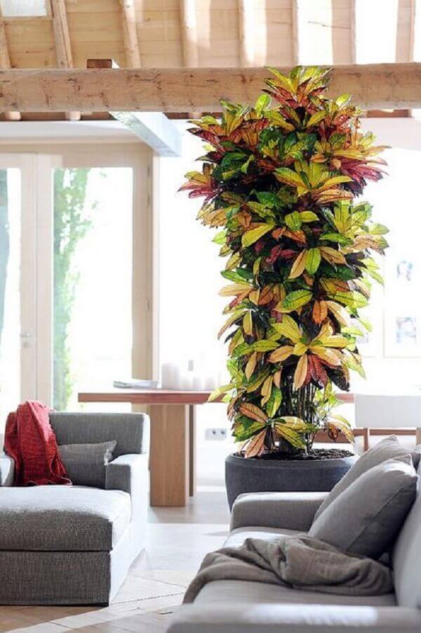 É uma planta que chama atenção por sua coloração, tem folhas grandes e pode ter tons de verde, branco, vermelho, amarelo e outros. Essa planta vai ficar linda na decoração e ajudar a compor com outras plantas. É importante que essa planta fique perto de um local que bata sol direto, por isso coloque perto de uma janela que recebe sol. Dica importante sobre o cróton: ao mexer na planta use sempre luvas, pois ele tem uma seiva que provoca irritação na pele.