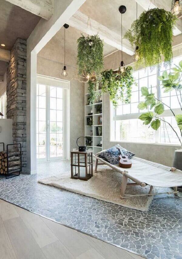 O destaque desse estilo é a folhagem, as flores não estão muito presentes, por isso que falamos em levar o verde para dentro de casa, pois literalmente é o verde. Verdes de diversos tons e em todos os lugares, no chão, pendurado, em móveis. Onde encontrar lugar para colocar.