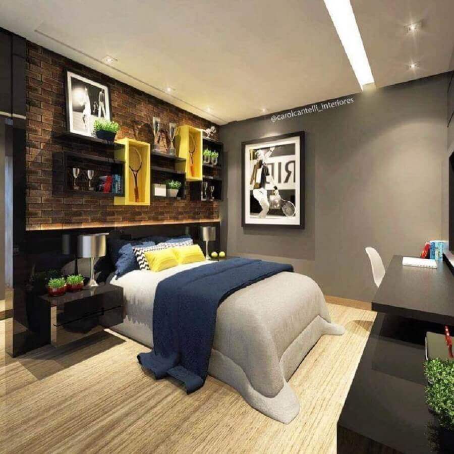 Como cores frias são mais usadas no quarto juvenil masculino a dica para deixar esse ambiente mais aconchegante e acolhedor é investir em móveis e até mesmo prateleiras ou nichos de madeira, além disso, o cimento queimado ou mesmo uma parede de tijolinho à vista podem ajudar o quarto juvenil masculino a ganhar mais sensação de conforto.