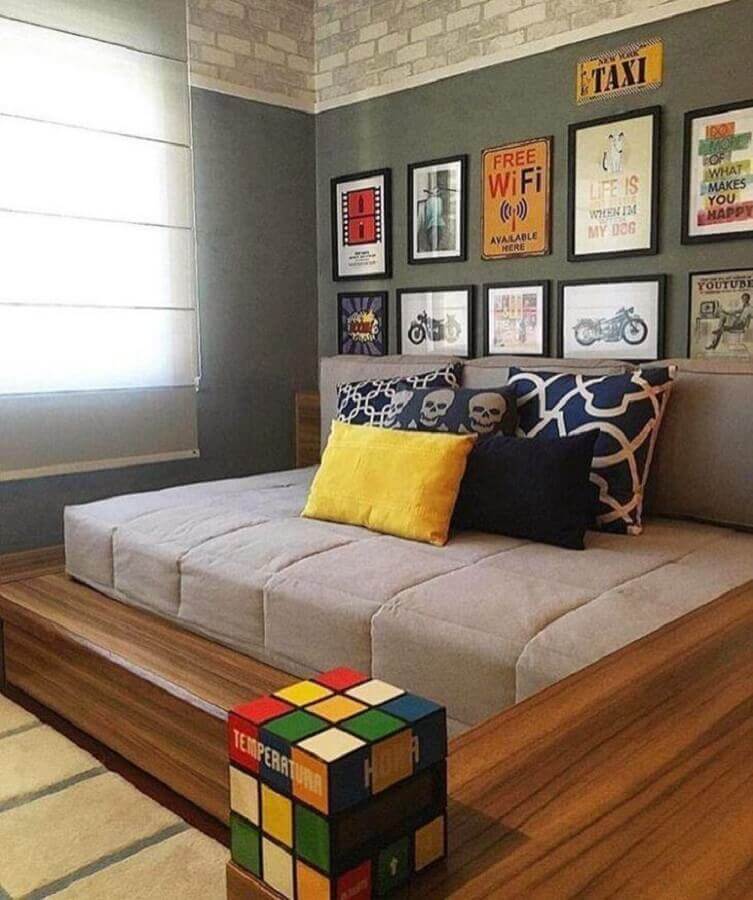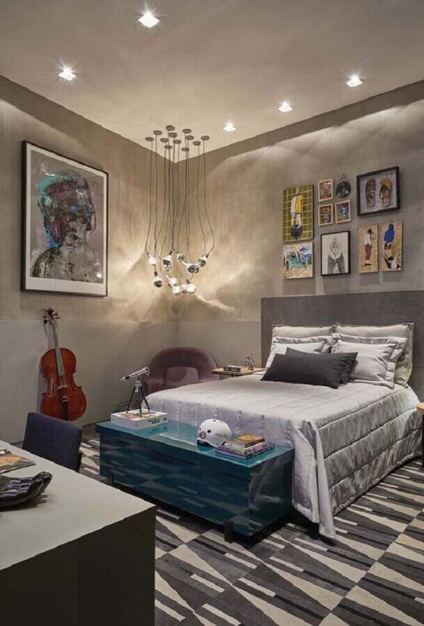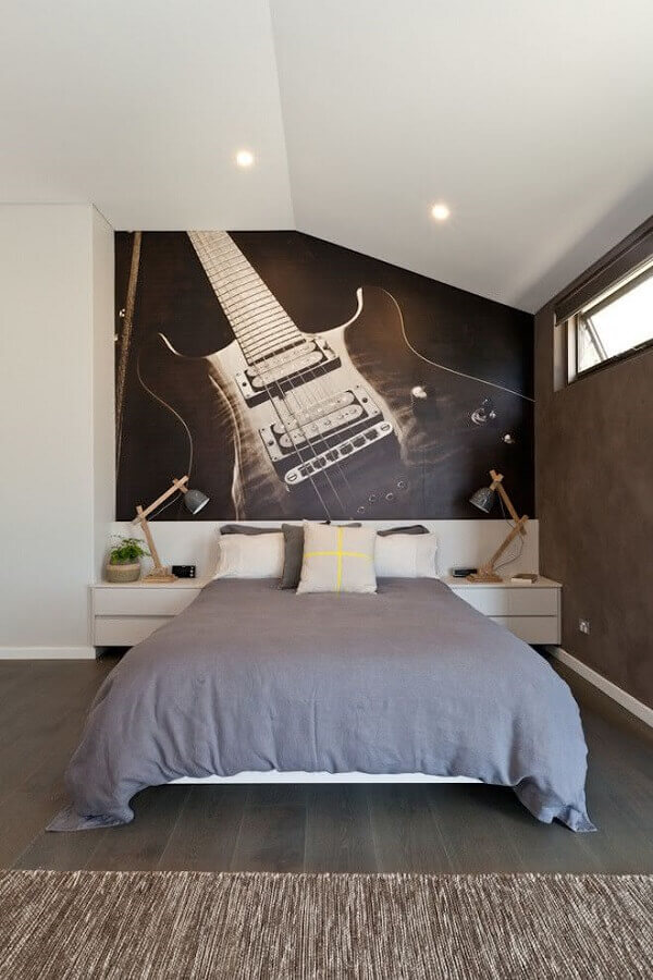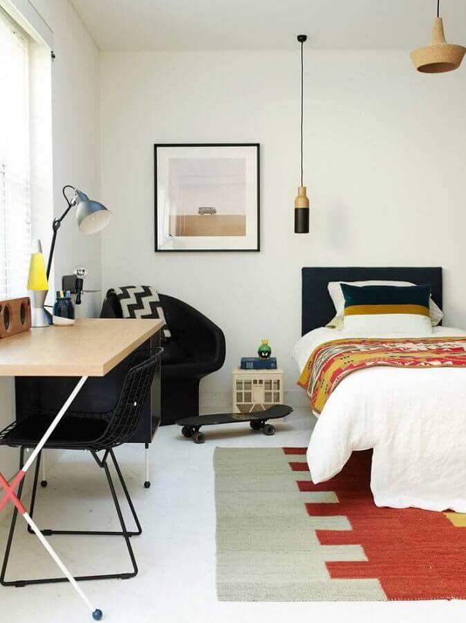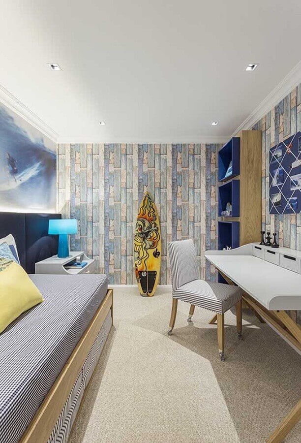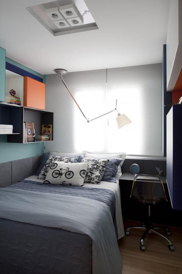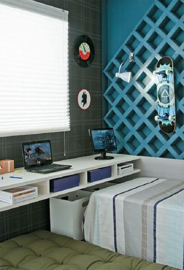 Assim como no quarto feminino o clássico é usar tons de rosa e lilás, no quarto juvenil masculino comumente as cores mais usadas são tons de azul e verde, mas claro, que você pode optar por outra cartela de cores para que o ambiente fique com a personalidade do dono do quarto.