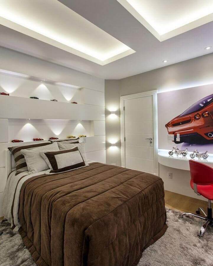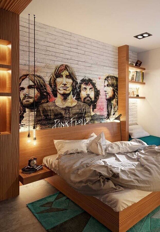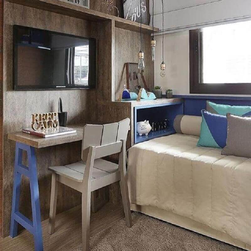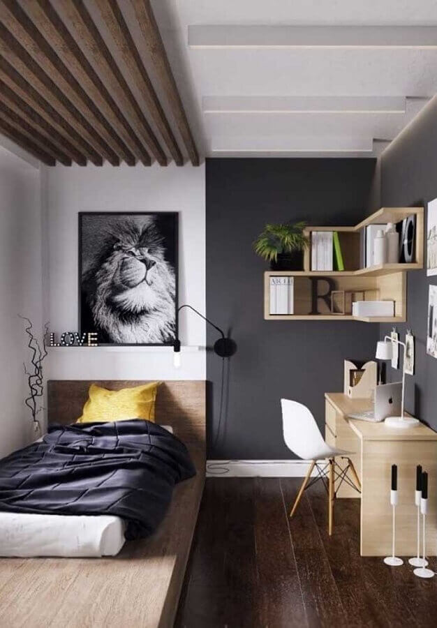 Como cores frias são mais usadas no quarto juvenil masculino a dica para deixar esse ambiente mais aconchegante e acolhedor é investir em móveis e até mesmo prateleiras ou nichos de madeira, além disso, o cimento queimado ou mesmo uma parede de tijolinho à vista podem ajudar o quarto juvenil masculino a ganhar mais sensação de conforto.