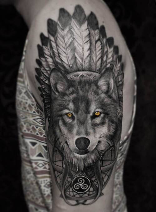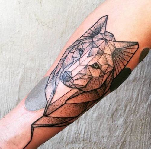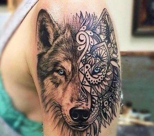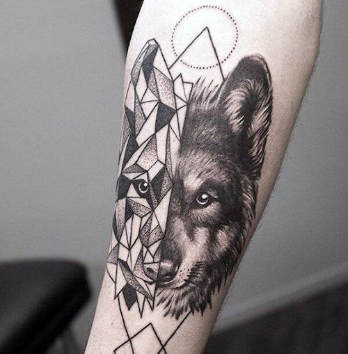 6# Aqui temos outra opção de tatuagem de lobo 50/50, mas desta vez apostando em traços vazados.