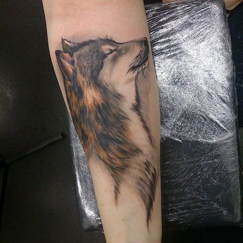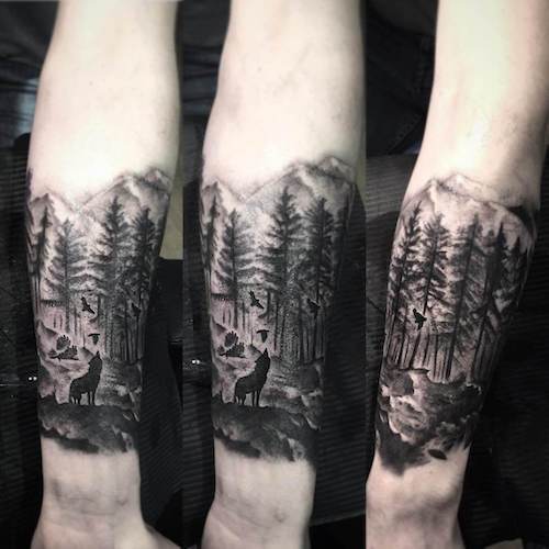 4# A tattoo de lobo não precisa ser focada no focinho. Aqui, o tatuador fez apenas o vulto dele uivando numa floresta.