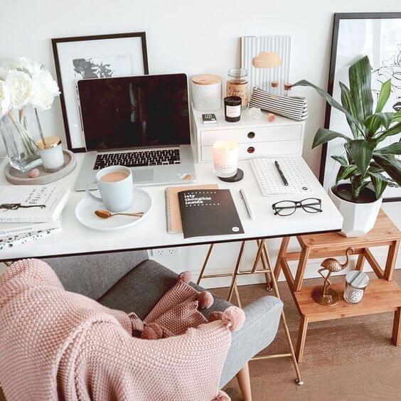 Para evitar as dores, você pode colocar uma almofada confortável na cadeira, ou deixar uma mantinha à disposição. Assim, toda vez que precisar, pode se aconchegar na mesa de estudo e passar horas focada.