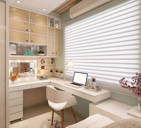 Você tem um canto no quarto que está livre? Então vale a pena fazer uma mesa de estudo em l para ganhar espaço e ter uma mesa que caiba diferentes elementos de uma única vez.