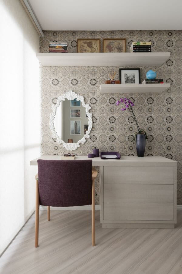 O ideal é que a mesa de estudo para quarto pequeno não atrapalhe a circulação do ambiente; por conta disso, evite escolher um modelo grande demais ou que fique no seu caminho.