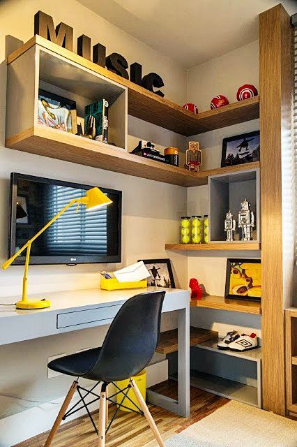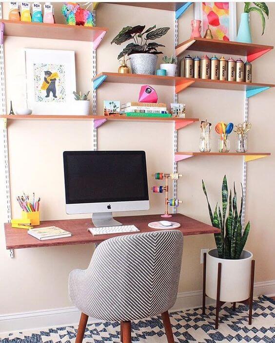Por ser pequena, é interessante ter prateleiras para ajudar na decoração e facilitar a sua vida durante os estudos. Você consegue colocar livros, bonecos criativos e até decorar com quadrinhos bonitos, como feito na foto acima.