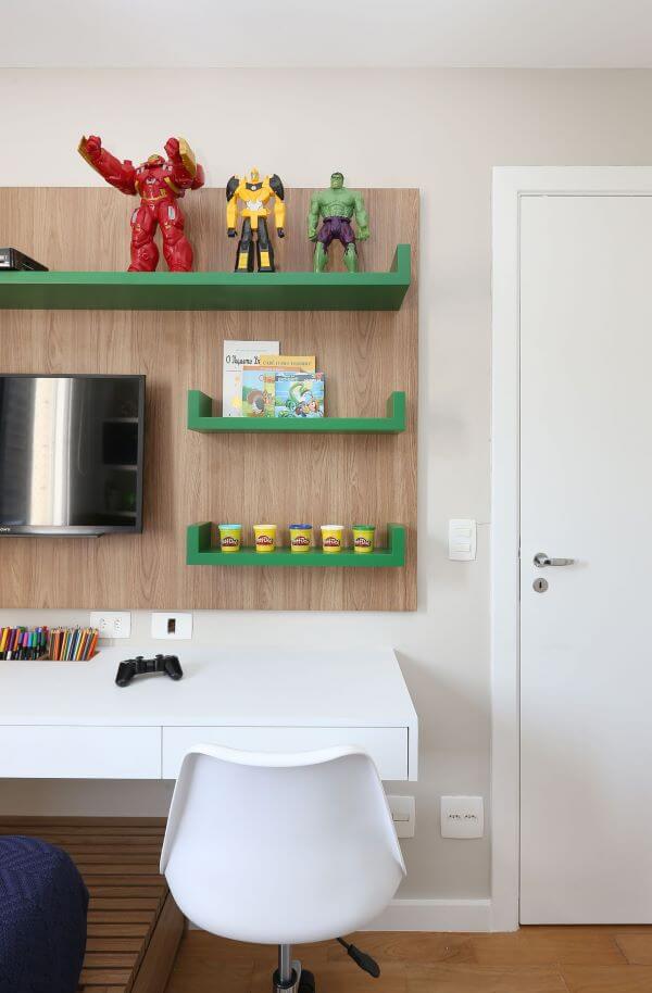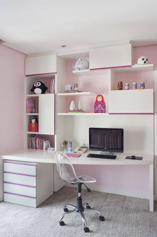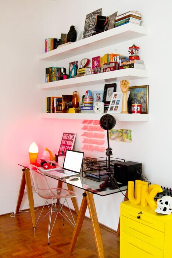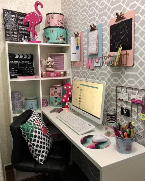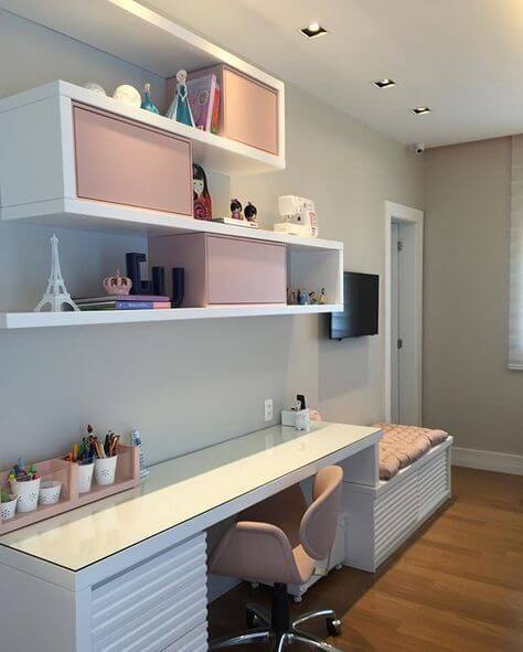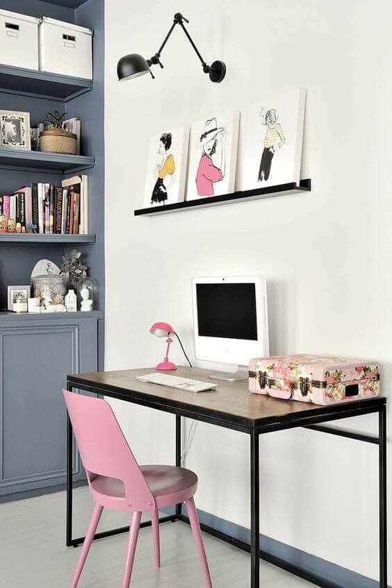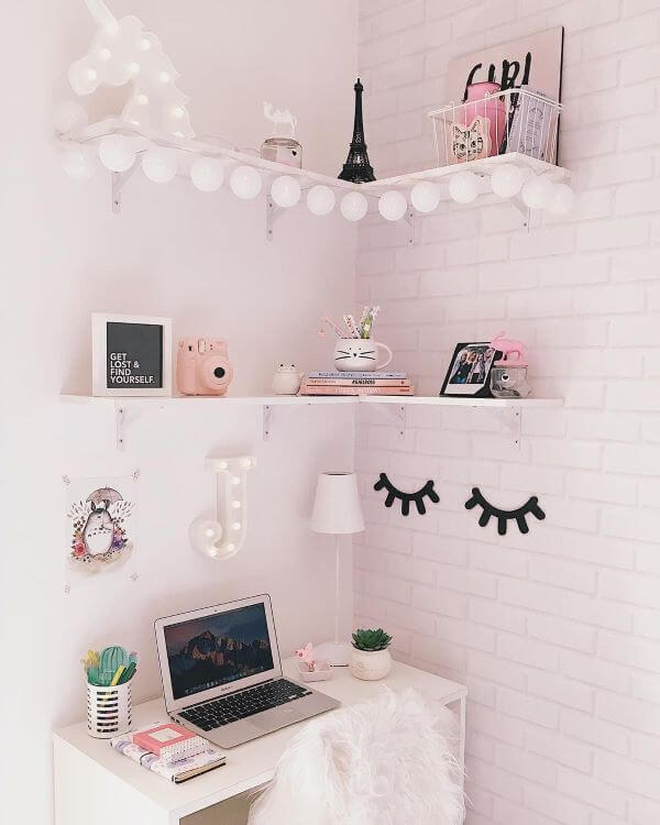 Por ser pequena, é interessante ter prateleiras para ajudar na decoração e facilitar a sua vida durante os estudos. Você consegue colocar livros, bonecos criativos e até decorar com quadrinhos bonitos, como feito na foto acima.