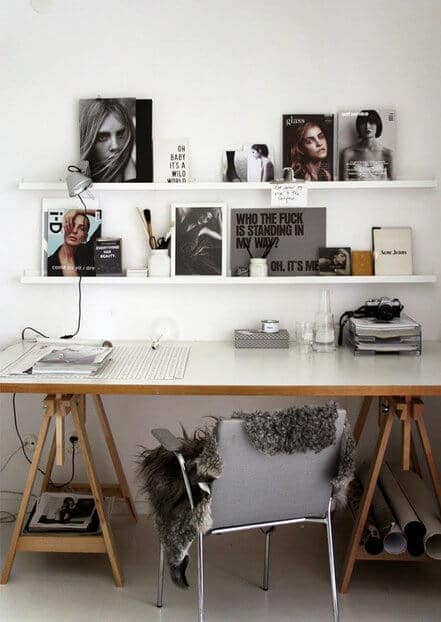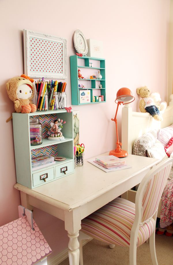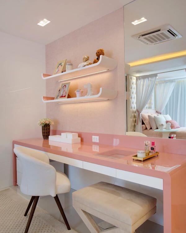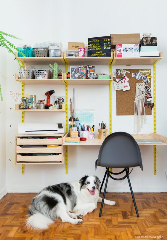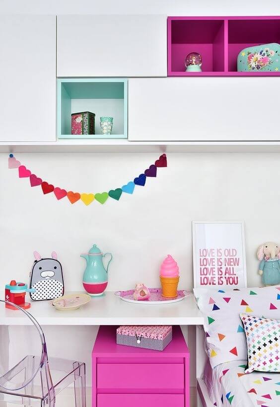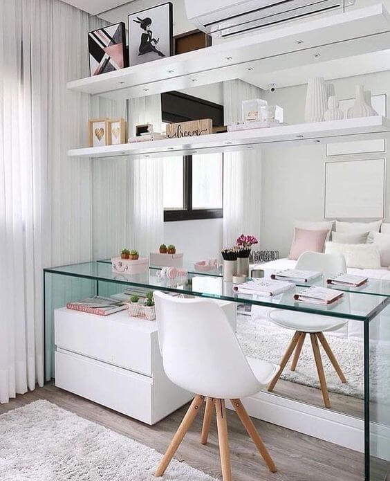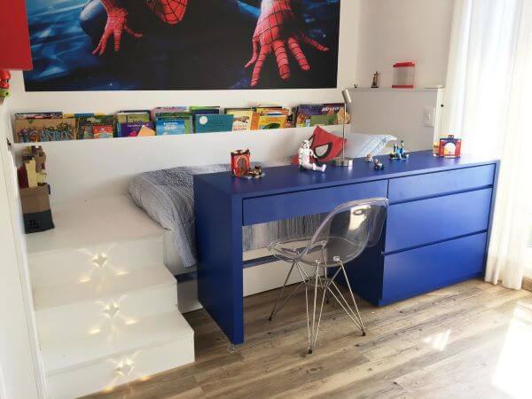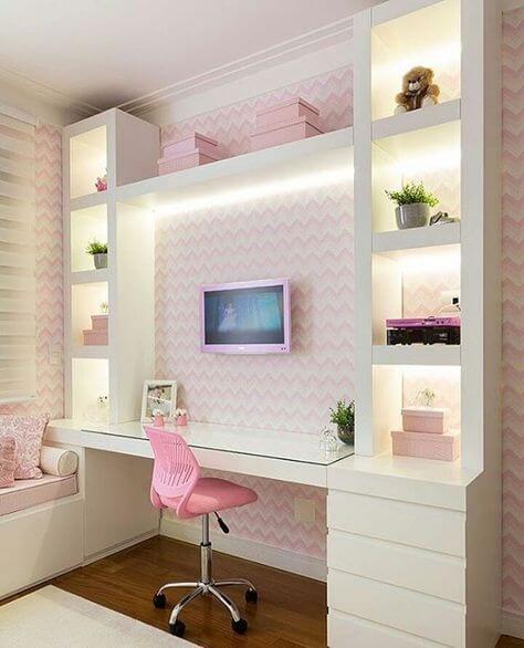 Por ser pequena, é interessante ter prateleiras para ajudar na decoração e facilitar a sua vida durante os estudos. Você consegue colocar livros, bonecos criativos e até decorar com quadrinhos bonitos, como feito na foto acima.