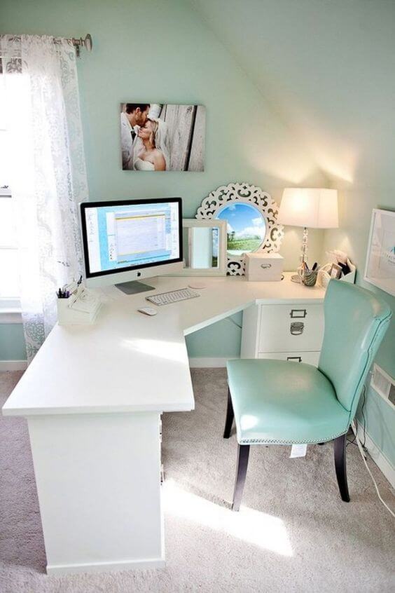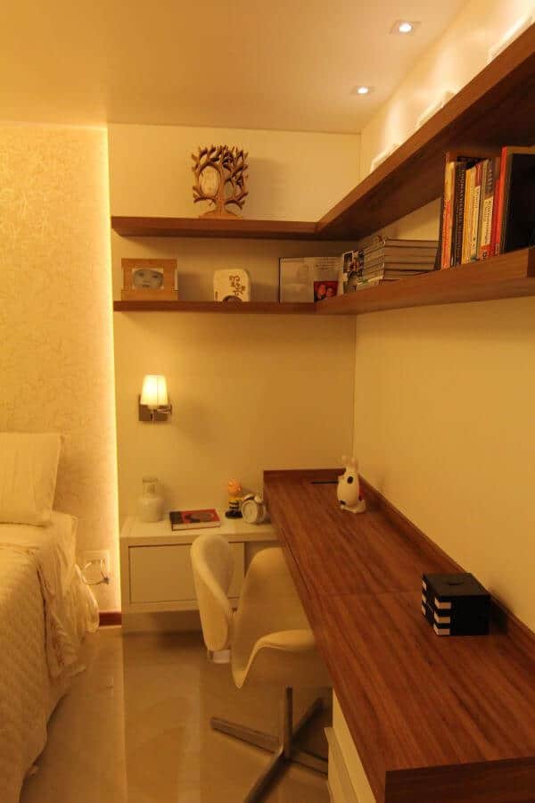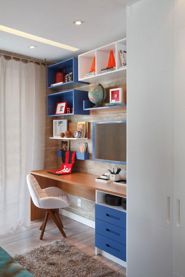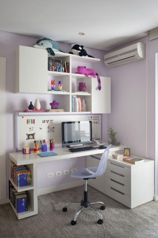 Você tem um canto no quarto que está livre? Então vale a pena fazer uma mesa de estudo em l para ganhar espaço e ter uma mesa que caiba diferentes elementos de uma única vez.