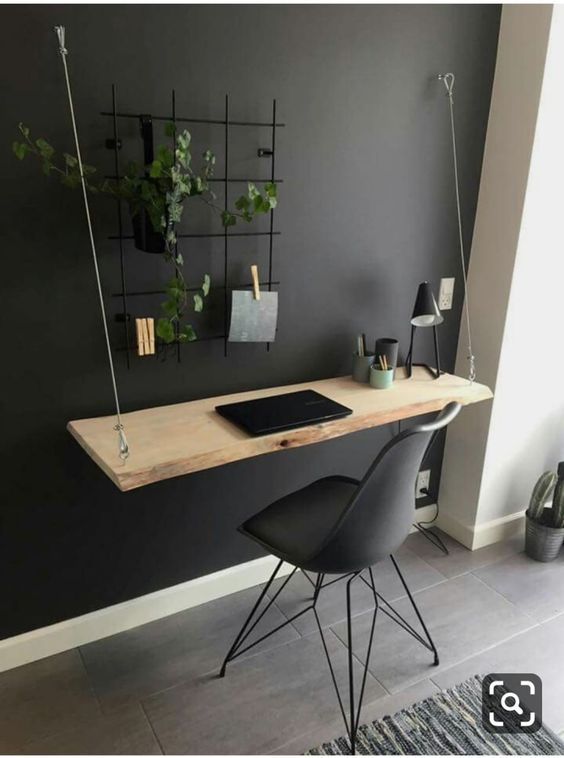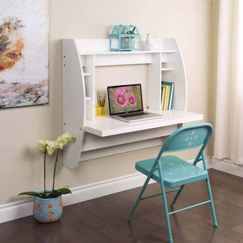 A vantagem da mesa de estudo suspensa é que ela não possui pés. Ela é fixa na parede, geralmente num tamanho menor.