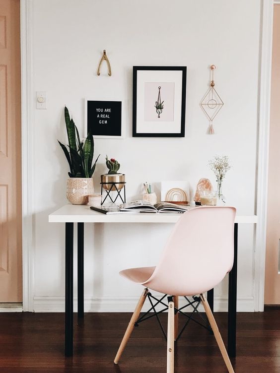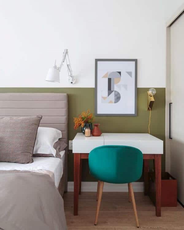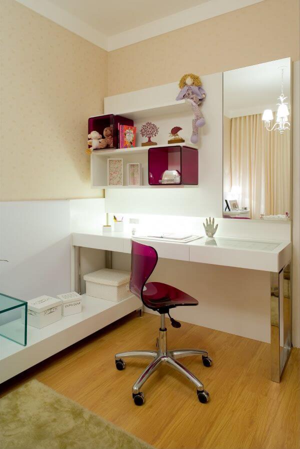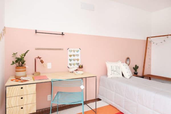 O ideal é que a mesa de estudo para quarto pequeno não atrapalhe a circulação do ambiente; por conta disso, evite escolher um modelo grande demais ou que fique no seu caminho.