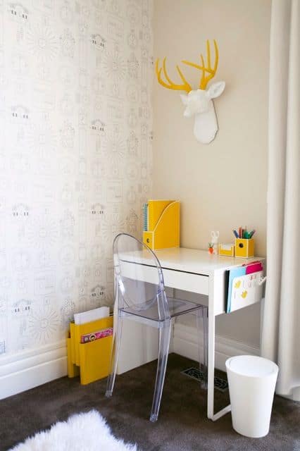 Para deixar a mesa de estudo infantil mais atrativa para os seus filhos, vale a pena usar cadeiras e decorações coloridas. Além disso, deixe canetas, papéis e materiais artísticos à disposição deles.