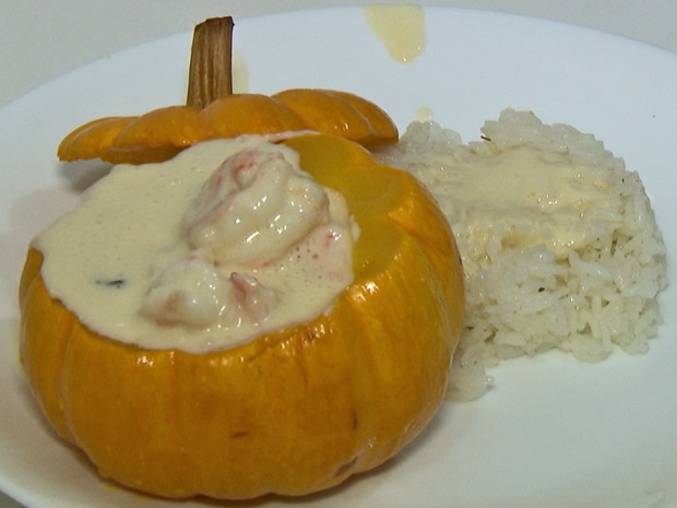 - Em uma panela aqueça 50ml de azeite e quando estiver bem quente, refogue os camarões até que mudem de cor (rosada). Adicione a abóbora batida e ajuste o tempero com o sal e a pimenta.