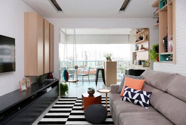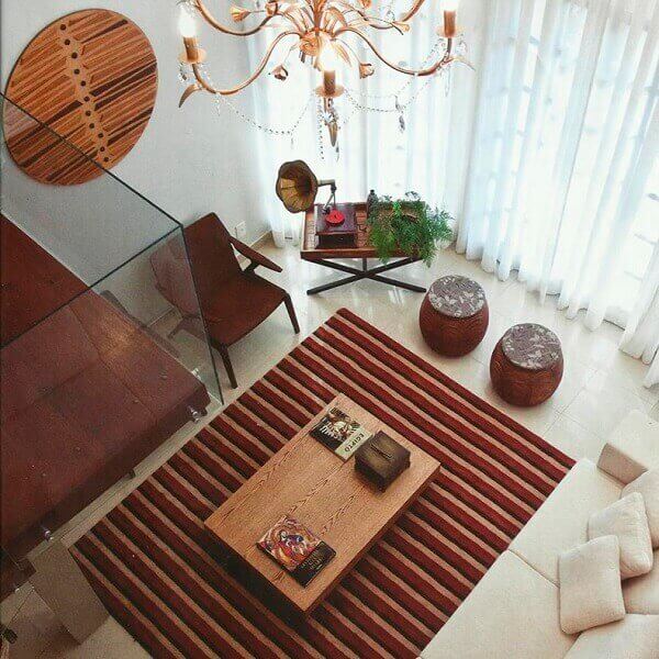 Esta estratégia decorativa é bem importante, sobretudo, quando estamos falando de ambientes abertos, com cômodos distintos. A ideia, com o uso de tapetes, é criar um efeito delimitador, mesmo que não haja qualquer tipo de parede ou bancada. E vale até usar mais de um tapete, um sobre o outro, pois a composição fica moderna e linda!