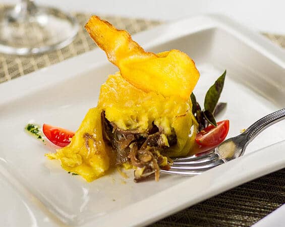 Deixe esfriar um pouco e cubra a carne com o purê.