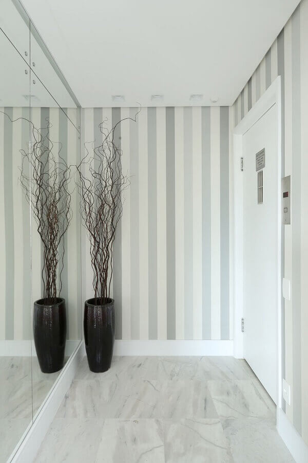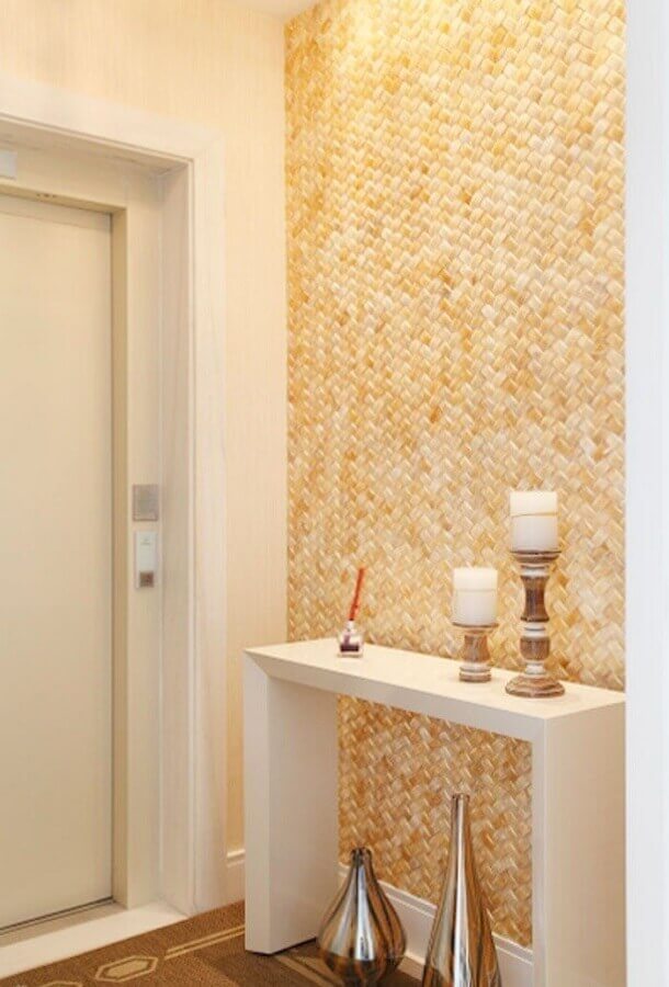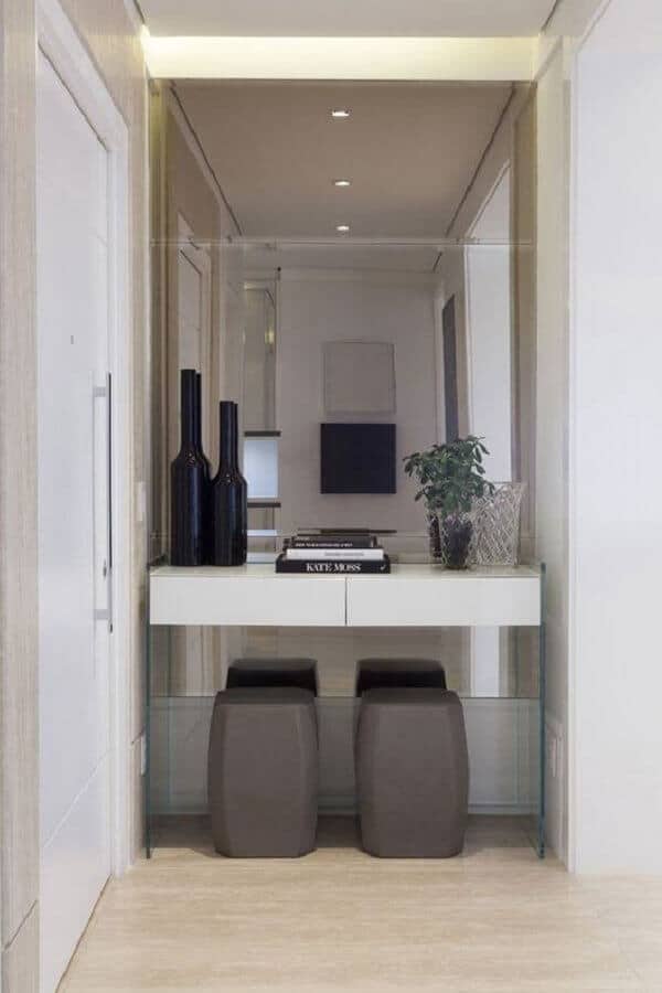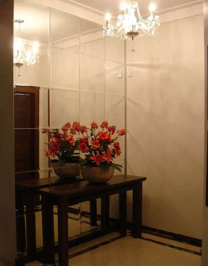 Aqui você pode investir em um hall de entrada pequeno com espelho em toda a parede dando um ar bem moderno ao espaço, ou decorar o hall de entrada pequeno com espelho menores na parede sobre o aparador, por exemplo.