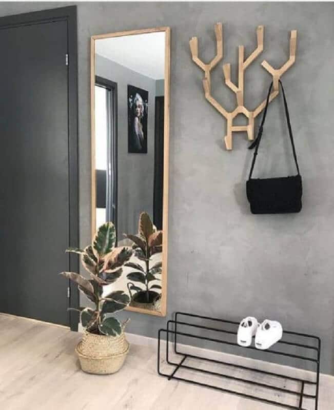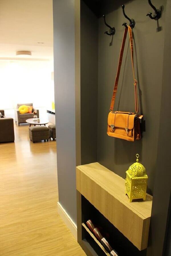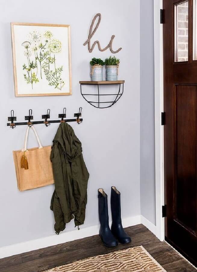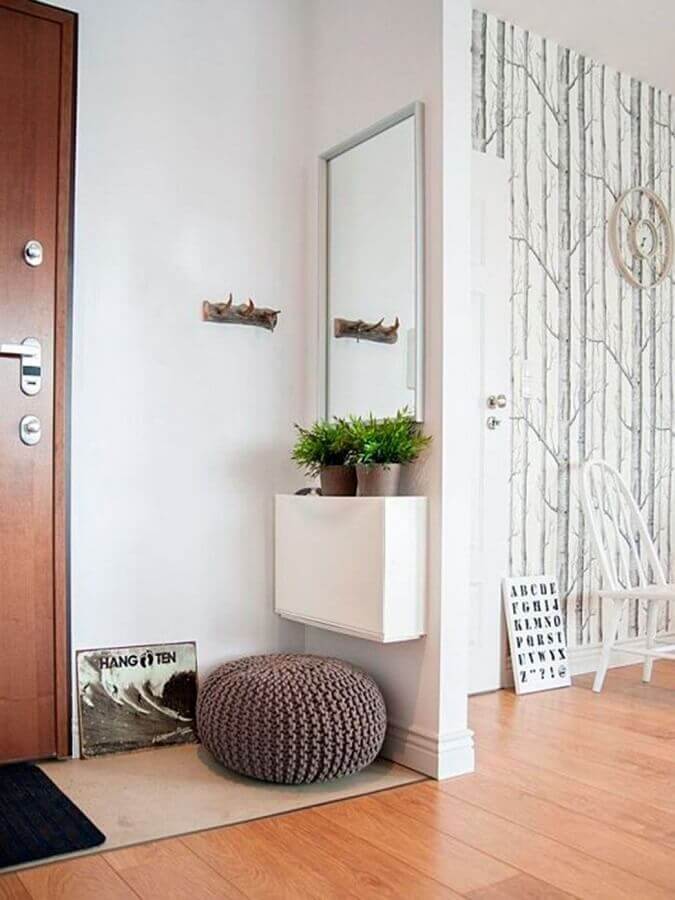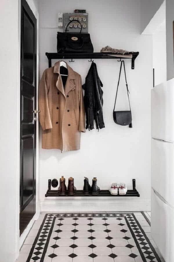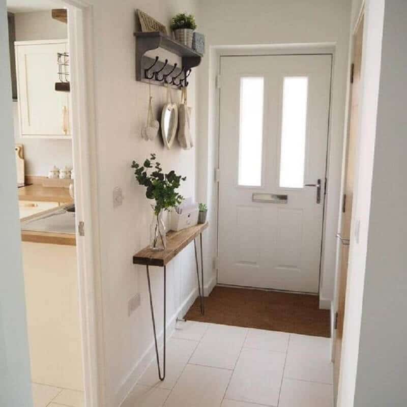 Além do espelho você também pode usar a parede do hall de entrada simples e pequeno de maneira mais funcional como instalando um cabideiro de parede ou ganchos onde você poderá pendurar uma bolsa, os casacos de suas visitas entre outros itens.