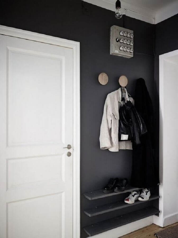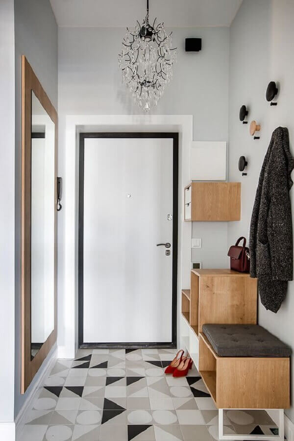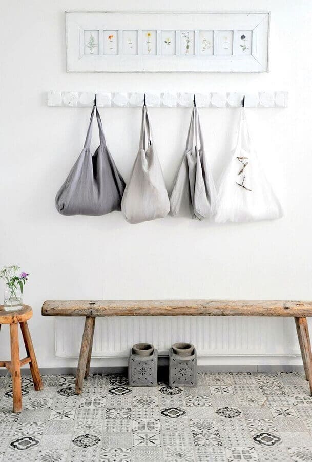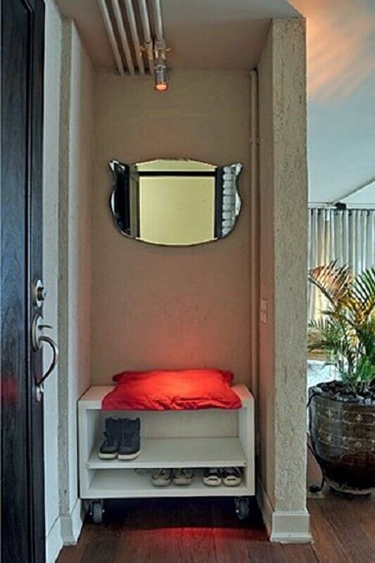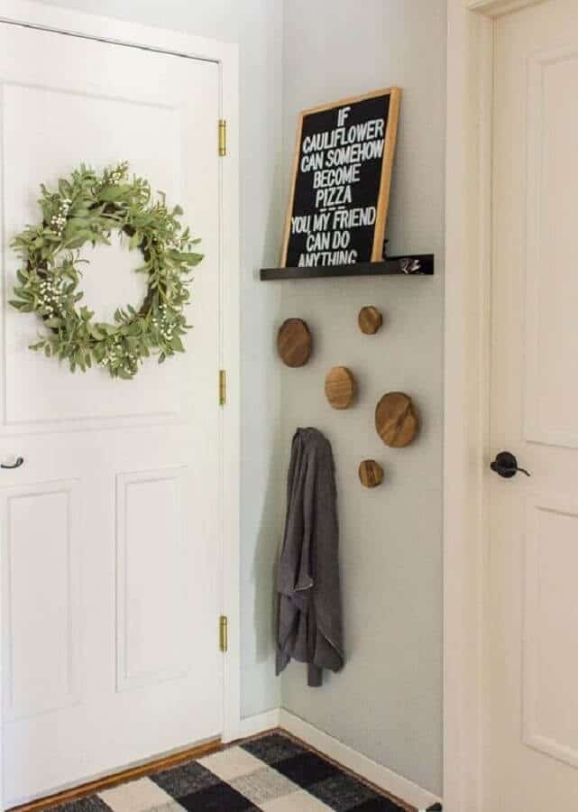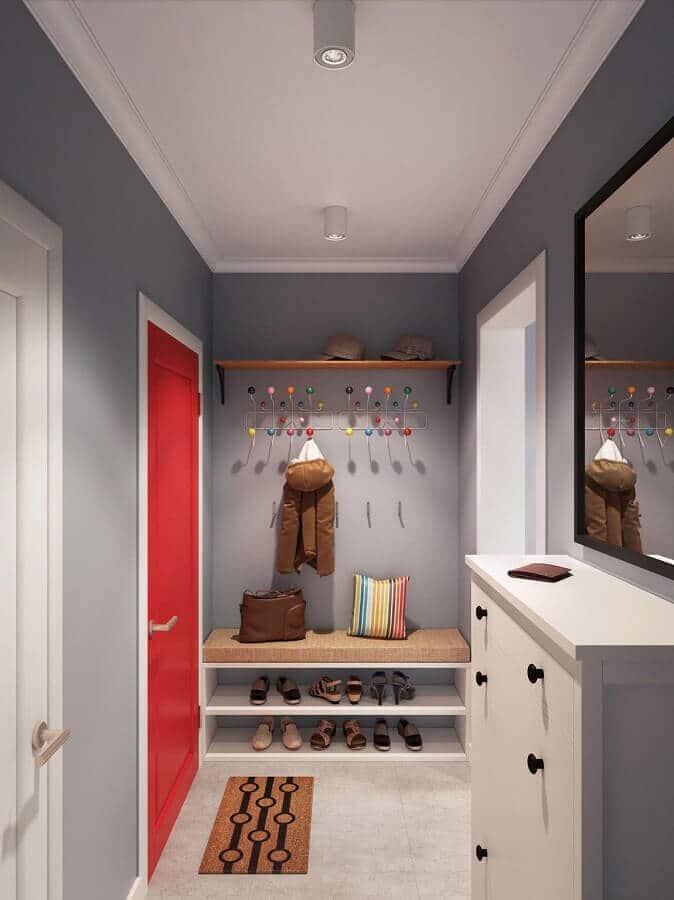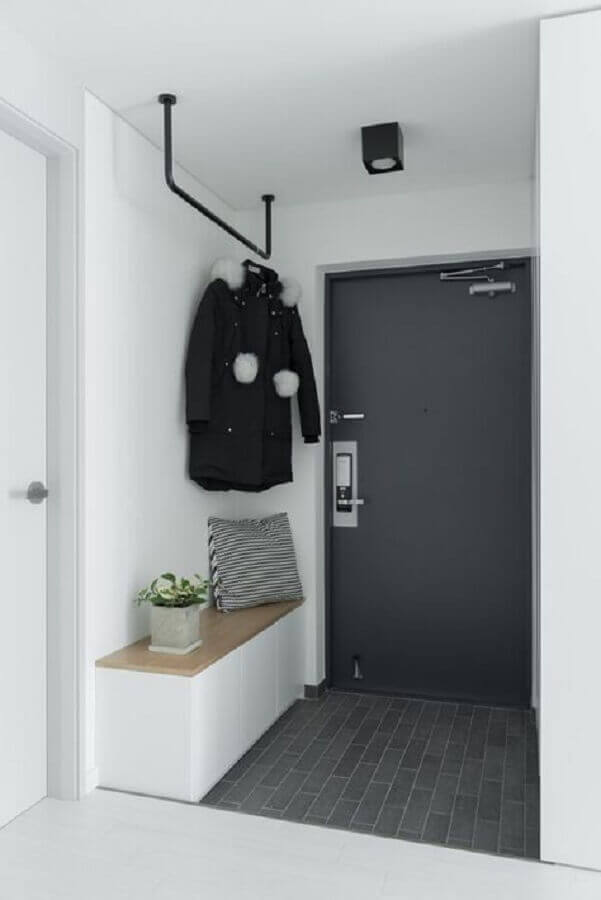 Além do espelho você também pode usar a parede do hall de entrada simples e pequeno de maneira mais funcional como instalando um cabideiro de parede ou ganchos onde você poderá pendurar uma bolsa, os casacos de suas visitas entre outros itens.
