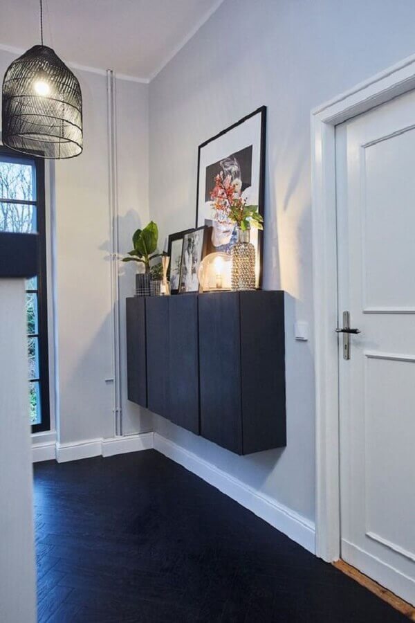 Como falamos acima, optar por modelos planejados de aparador para hall de entrada pequeno é sempre uma ideia mais interessante para aproveitar melhor esse espaço, mas além disso, modelos suspensos de aparador para hall de entrada pequeno decorado também garantem mais leveza ao espaço compacto passando a sensação de um ambiente maior.