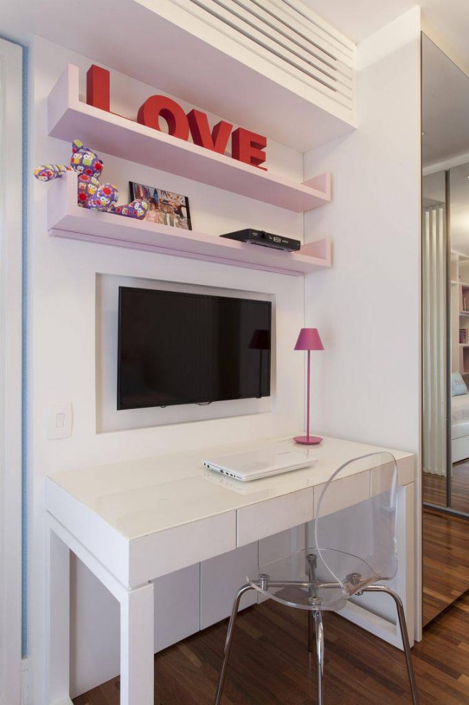 Para quem não tem tanto espaço no quarto e gosta de decoração mais clean, o ideal é investir em uma escrivaninha para quarto bem simples, com tons claros ou mesmo escrivaninha de vidro para quarto ou em outro material transparente. Esses tons e materiais dão impressão de ocupar menos espaço.