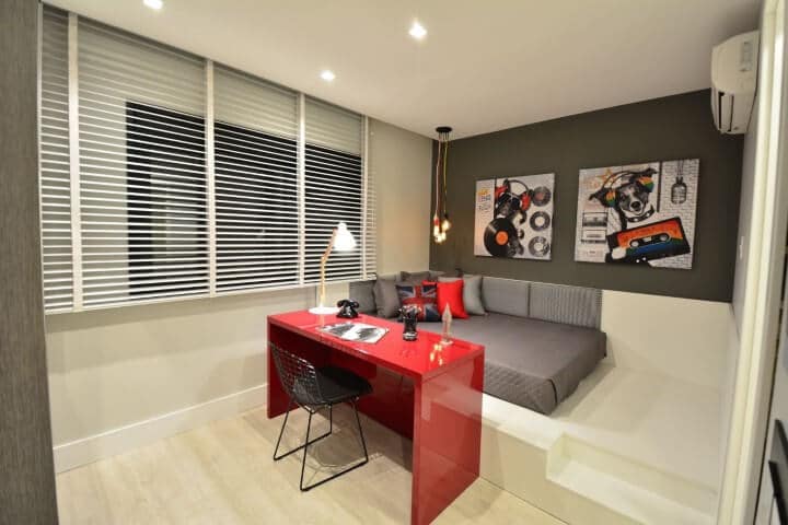 Se você quer deixar o quarto um pouco mais elegante, o espelho é uma ótima ideia. Usar um espelho com uma bela moldura atrás da escrivaninha para quarto pequeno vai dar um toque especial ao ambiente, além da sensação de que ele é maior. Fora isso, a escrivaninha para quarto pode ser “dois em um”, pois, além de ser o local de estudos, também pode se tornar um lugar pra fazer maquiagens, por exemplo. As mulheres vão adorar!