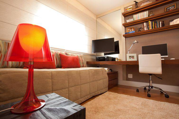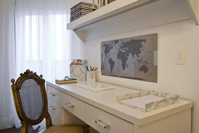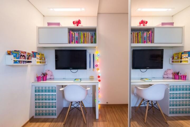 Se você quer deixar o quarto um pouco mais elegante, o espelho é uma ótima ideia. Usar um espelho com uma bela moldura atrás da escrivaninha para quarto pequeno vai dar um toque especial ao ambiente, além da sensação de que ele é maior. Fora isso, a escrivaninha para quarto pode ser “dois em um”, pois, além de ser o local de estudos, também pode se tornar um lugar pra fazer maquiagens, por exemplo. As mulheres vão adorar!
