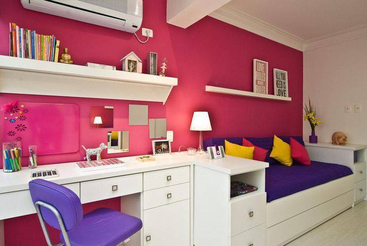 Há quem goste de decoração colorida – são super charmosas, por acaso – e claro que é possível ter um ambiente de trabalho cheio de cores e detalhes. Existem no mercado diversos tipos de escrivaninha para quarto e as coloridas não ficam de fora.