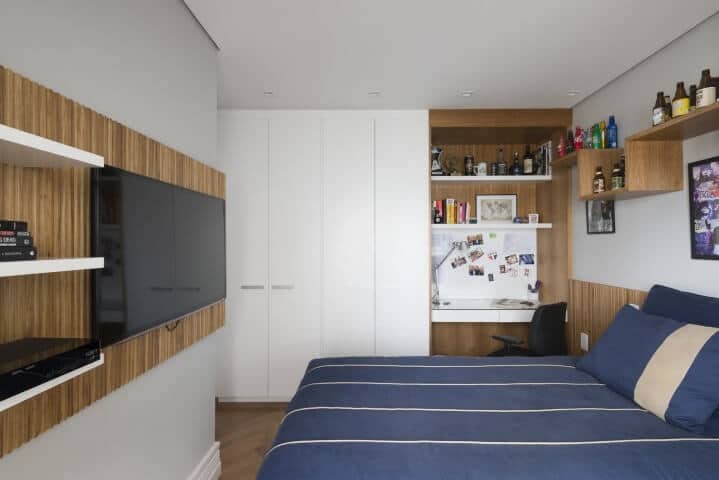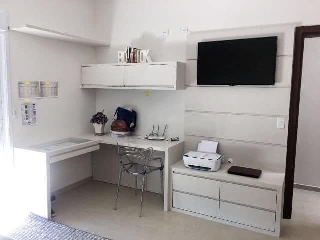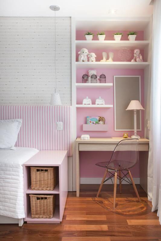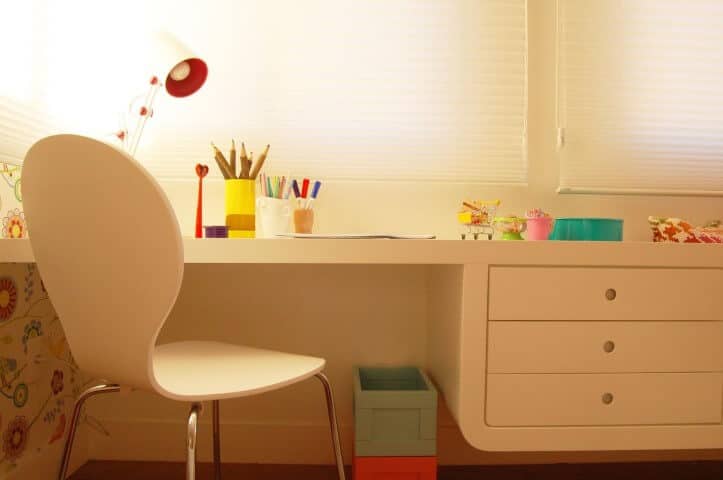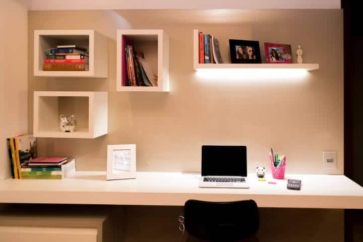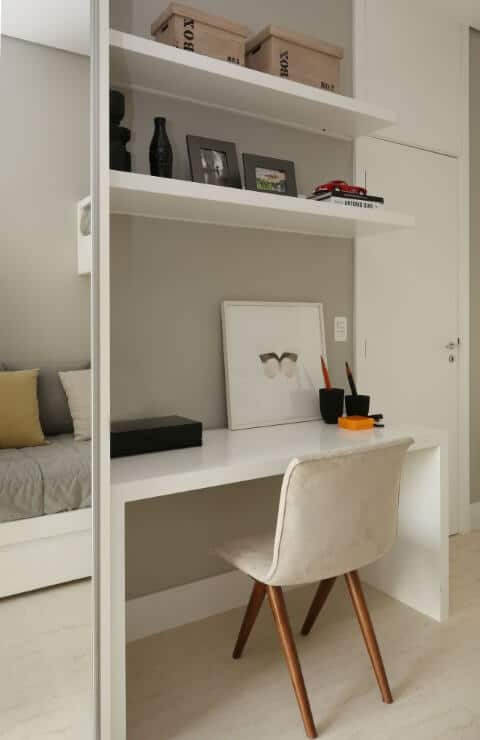 Para quem não tem tanto espaço no quarto e gosta de decoração mais clean, o ideal é investir em uma escrivaninha para quarto bem simples, com tons claros ou mesmo escrivaninha de vidro para quarto ou em outro material transparente. Esses tons e materiais dão impressão de ocupar menos espaço.