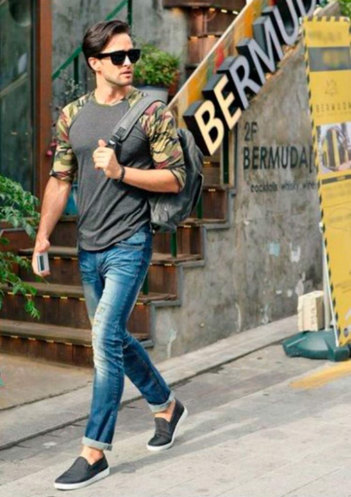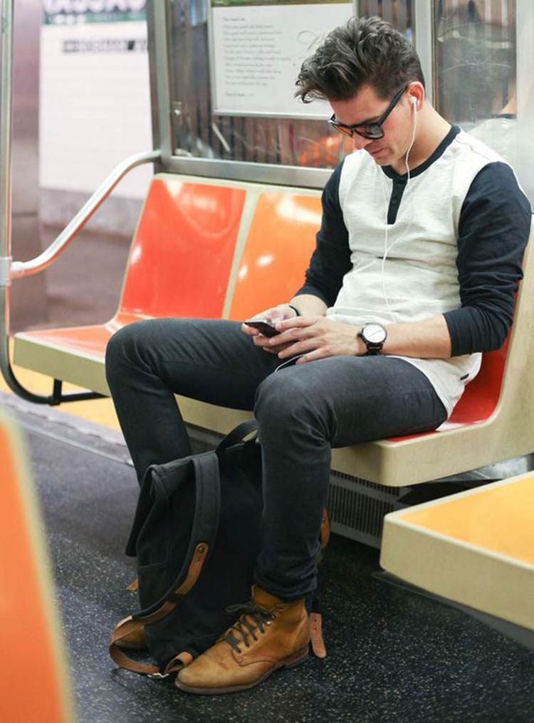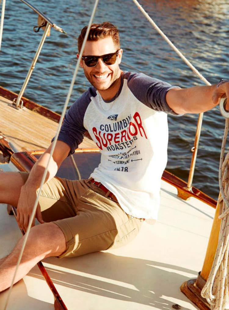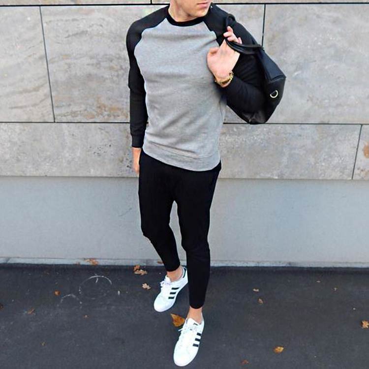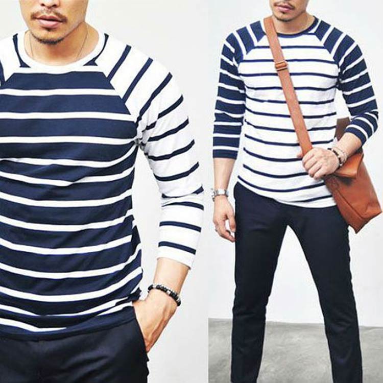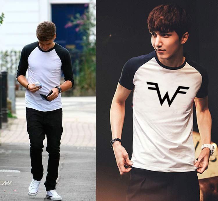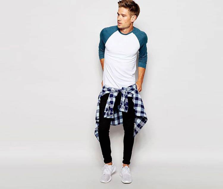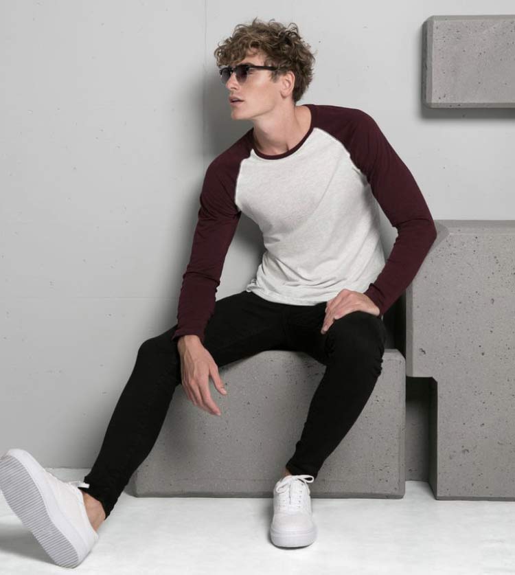 O modelo de camiseta raglan, caracterizado pelas mangas com cores diferentes, está em alta nessa temporada. Separei algumas fotos de homens usando esse tipo de camiseta para inspiração, confira: