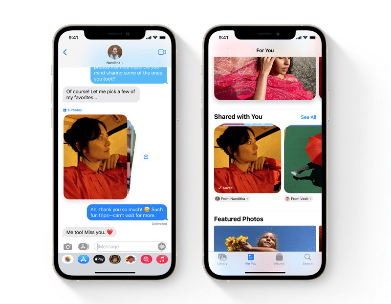 Na nova seção Compartilhado com Você, os links, imagens e outros conteúdos que chegam pelo Mensagens agora aparecem nos apps compatíveis. Dá até para responder direto no app, sem precisar voltar para o Mensagens.