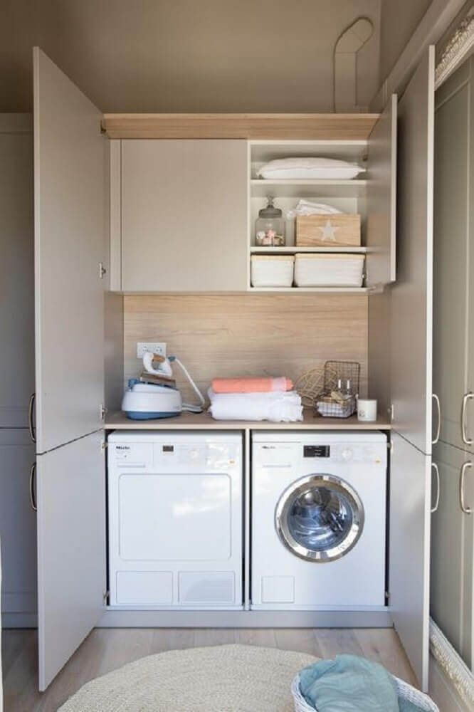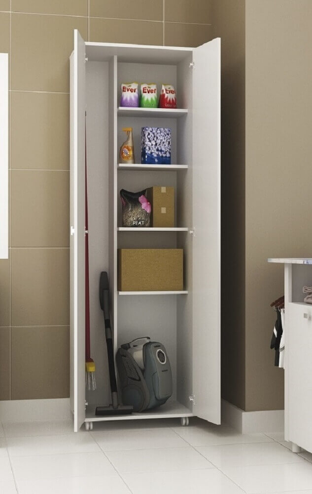 Um modelo de armário para lavanderia pequena que é muito útil e prático para o dia a dia é o armário multiuso, esse modelo de armário pequeno para lavanderia é planejado de forma a otimizar o espaço sendo possível até guardar rodos, vassouras e baldes dentro dele, além dos produtos de limpeza.