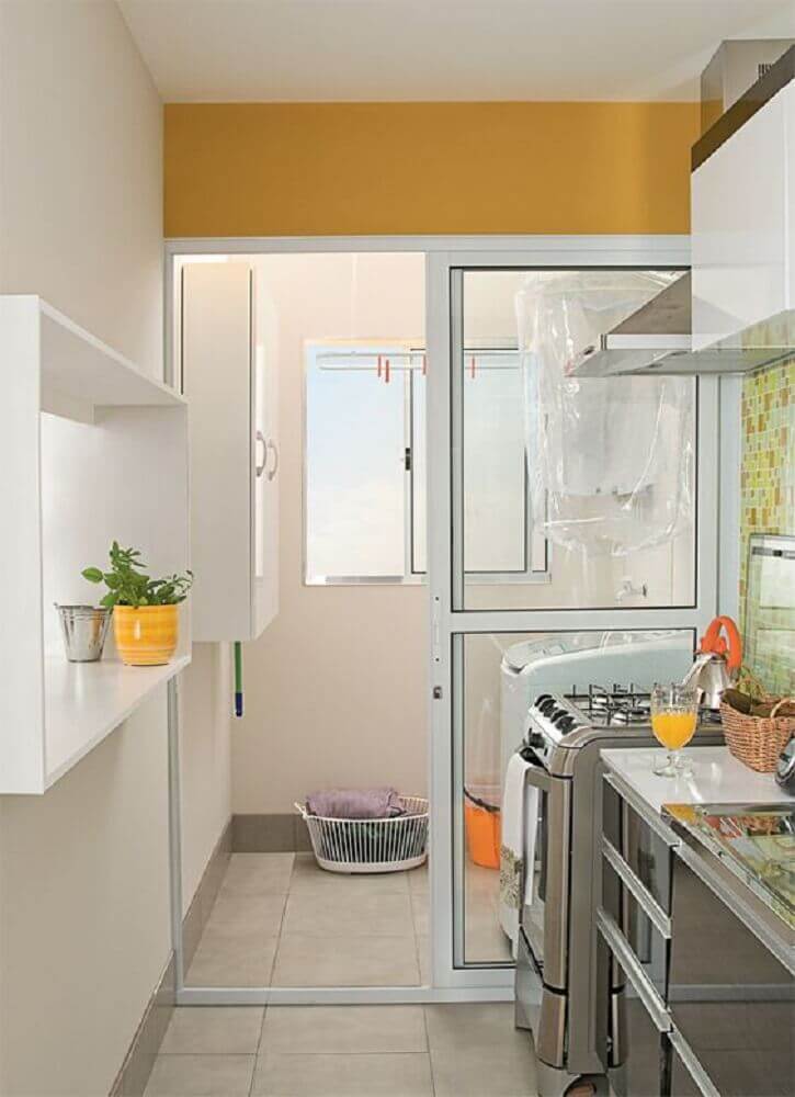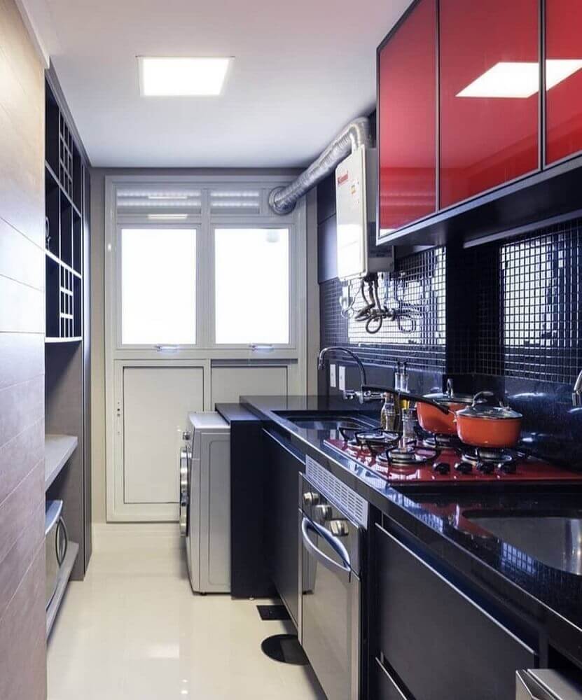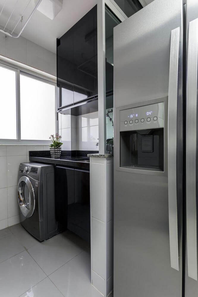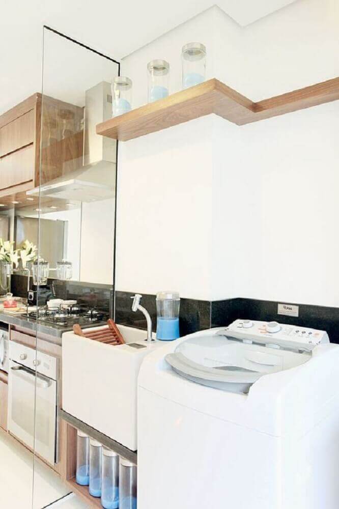Outra grande vantagem da lavanderia pequena planejada é quando a área de serviço é integrada a cozinha. Nesses casos é importante que a lavanderia pequena possua o mesmo estilo de decoração que a cozinha deixando assim o ambiente bem harmônico, sendo que você pode fazer uma cozinha com lavanderia pequena planejada com as mesmas cores, acabamentos e materiais.