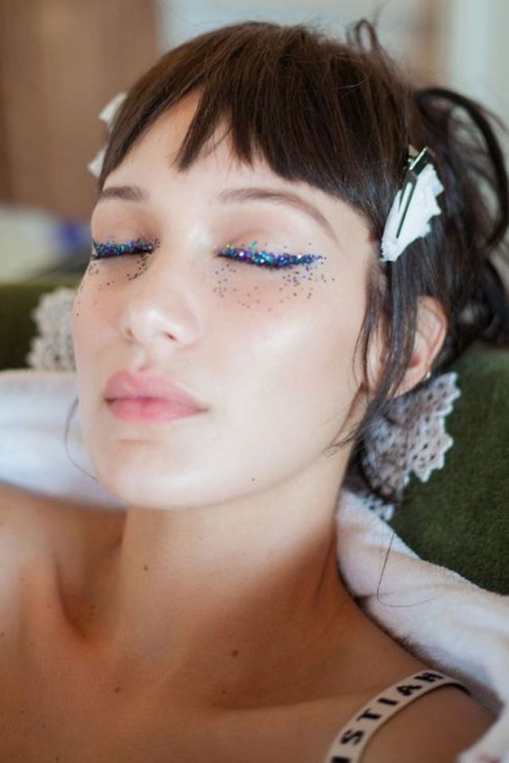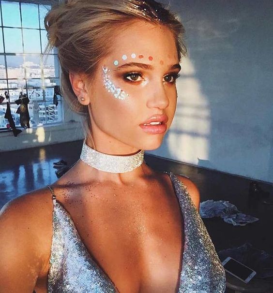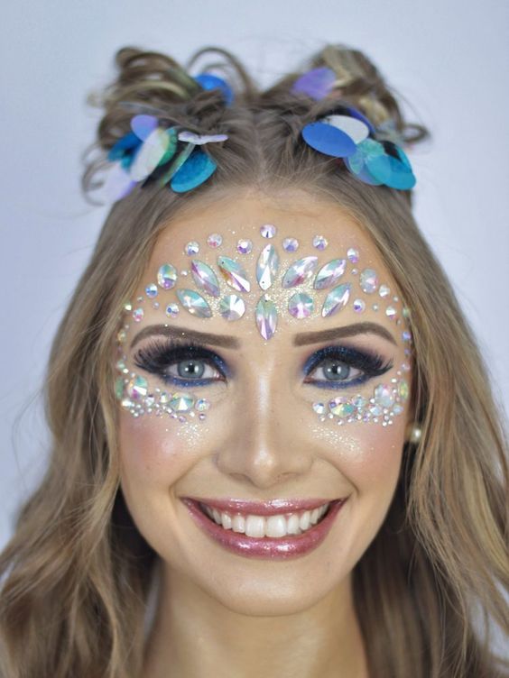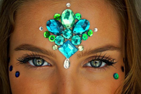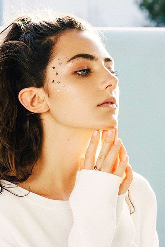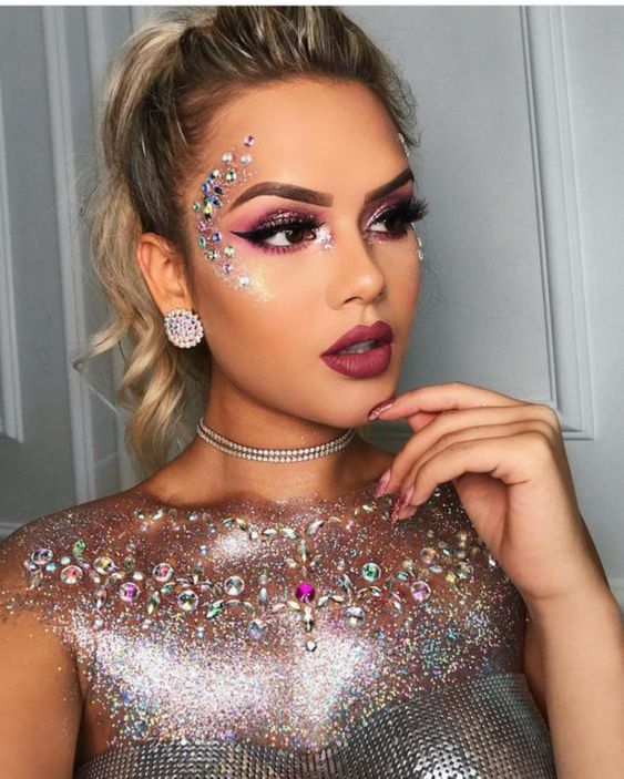As pedrarias saíram das bijuterias diretamente para a maquiagem, e acredite elas dão um charme a mais a ”make” essas pedrarias podem vir com formato de pérolas, cristais, estrelas e até corações. Você pode criar contornos em volta das sobrancelhas existe, também a alternativa de criar desenhos na região do rosto.