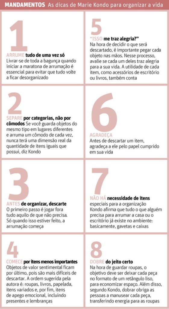 Caso você não saiba, Marie Kondo é considerada a maior referência em arrumação e desapego no mundo atual. A japonesa criou seu próprio método, chamado KonMari, onde ela usa alguns critérios que te fazem decidir se aquela peça de roupa ou objeto deve permanecer na sua vida (e na sua casa) ou não. O critério que ganhou mais fama foi o mais inusitado, onde ela pede que você abrace aquela peça ou objeto e se pergunte: “Isso me traz alegria?”. Dependendo da resposta, está definido se aquele item fica ou será doado.