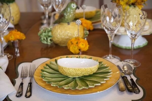 Em uma mesa posta para jantar ou almoço, a disposição das louças e talheres devem seguir as regras básicas de etiqueta como os garfos à esquerda e facas, colheres e taças à direita dos pratos. Coloque a colher de sobremesa sempre à frente do prato.