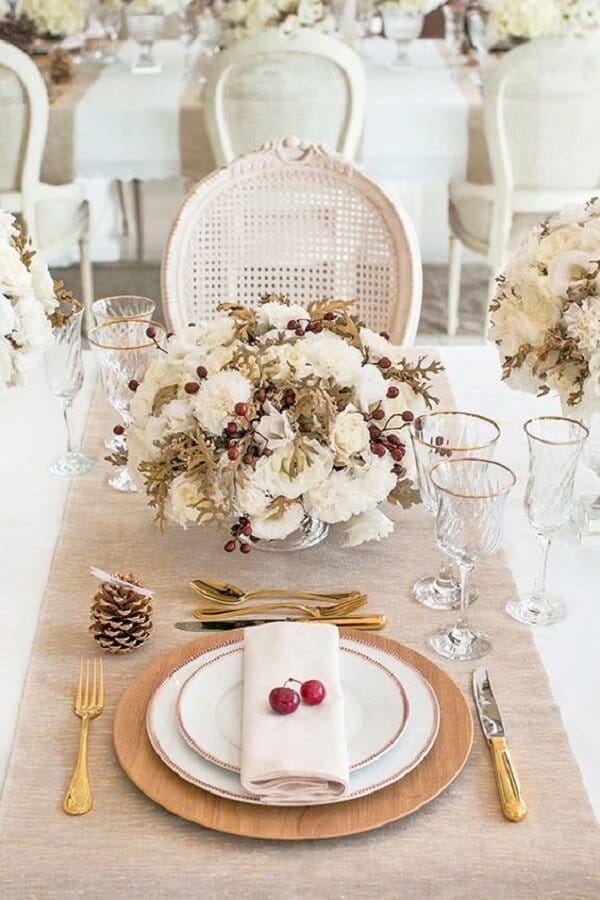 Para completar a decoração, sobre o prato foi colocado um guardanapo de linho no tom bege e claro que foram enfeitados com duas cerejas. O arranjo central de flores brancas tem galhos verdes secos e galhos com frutinhas vermelhas.