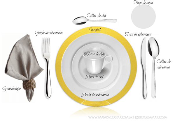 Os talheres precisam ser dispostos da seguinte forma: O garfo do lado esquerdo e a faca e colher do lado direito. Coloque a colher do café sobre o pires à direita e o guardanapo do lado esquerdo do garfo. Não esqueça que o copo com água pode ser colocado ao lado direito.