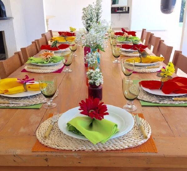 Os jogos americanos de tecidos coloridos ou confeccionados com bambus também são excelentes opções para decorar a mesa.  É importante ressaltar que os talheres para churrasco são próprios para carnes vermelhas. Opte por louças temáticas e copos para cerveja.